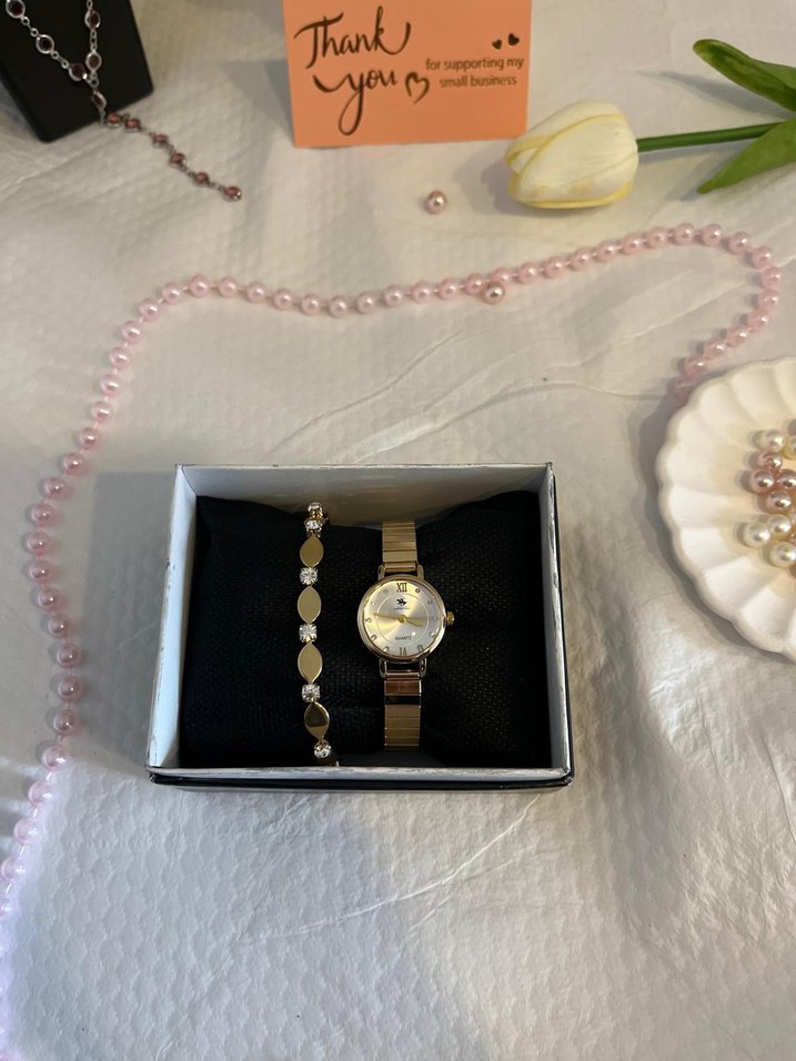 Altın renkli, kemerli kayışa sahip kadın kol saati. Modern klasik tasarımıyla hafif şıklık ve Paris havası sunar. Uyumluluk bileklik ile birlikte. ⌚