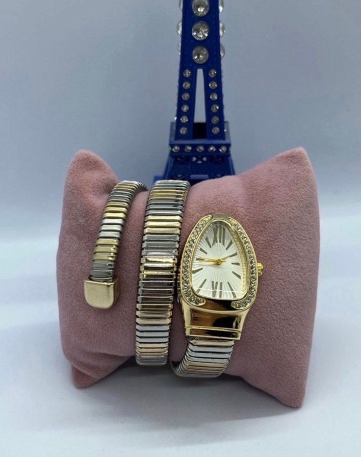 Altın renkli, kemerli tasarıma sahip kadın saati. Renkli ve esnek bileklik, klasik zarafeti Paris atmosferiyle buluşturuyor. ⌚