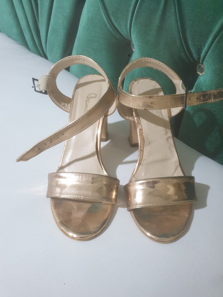 Altın renkli, kısa topuklu kadın sandalet. Parlak yılan desenli kauçuk malzeme ve tokalı bilek bağı içerir. Düğün için uygundur.