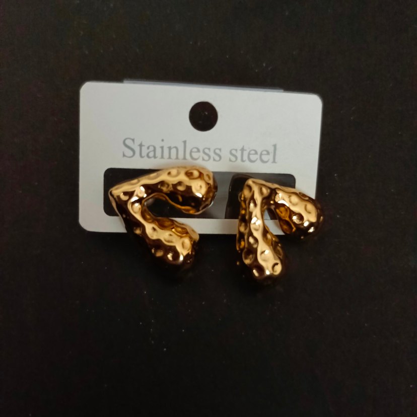 Paslanmaz çelikten, parlak yılan desenli, kıvrımlı kısa altın renkli küpeler. Cesur ve minimal bir tarz için uygundur.
