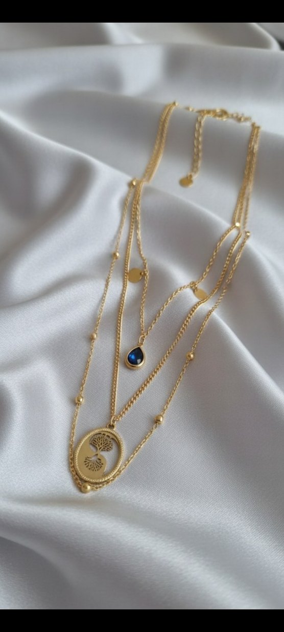 Altın renkli kısa zincirli kadın kolye, bohem tarzda ağaç ve mavi damla figürlü detaylar içerir. Günlük kullanıma uygundur.
