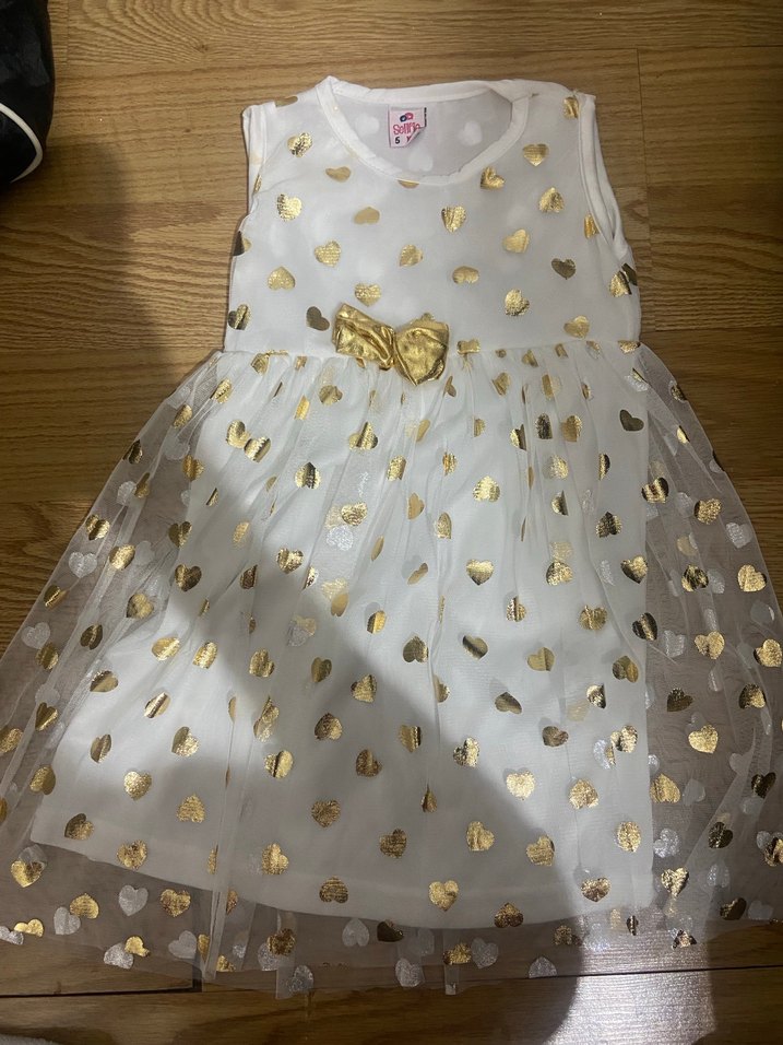 Altın renkli nakışlı kalpli, kolsuz kız çocuk elbisesi, yumuşak sentetik kumaş ve belde fırfır detayıyla. ✨