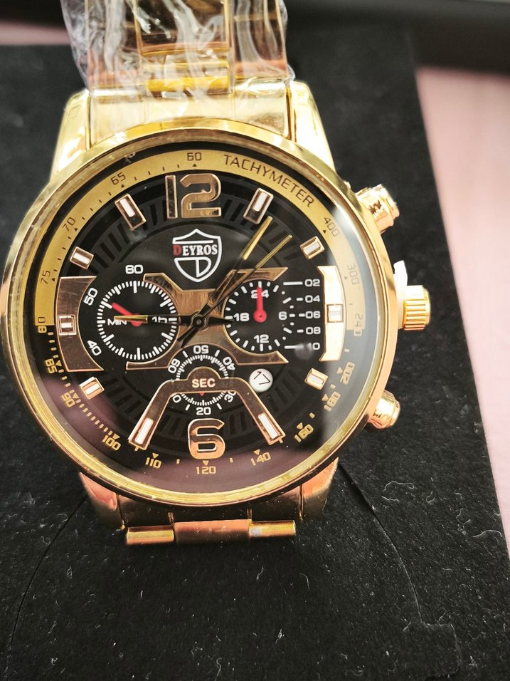 Altın renkli kasa ve siyah kadrana sahip erkek kol saati. Renkli detaylar, takimetre ve çoklu alt kadranlar bulunur. Klasik ve biker tarzı birleşimi. ⌚ Ürünlerimiz %100 yerli üretimdir ve kelepçelidir. ✅ Hiçbir yerde bulunmayan saatler ile tarzınızı ortaya koyun.