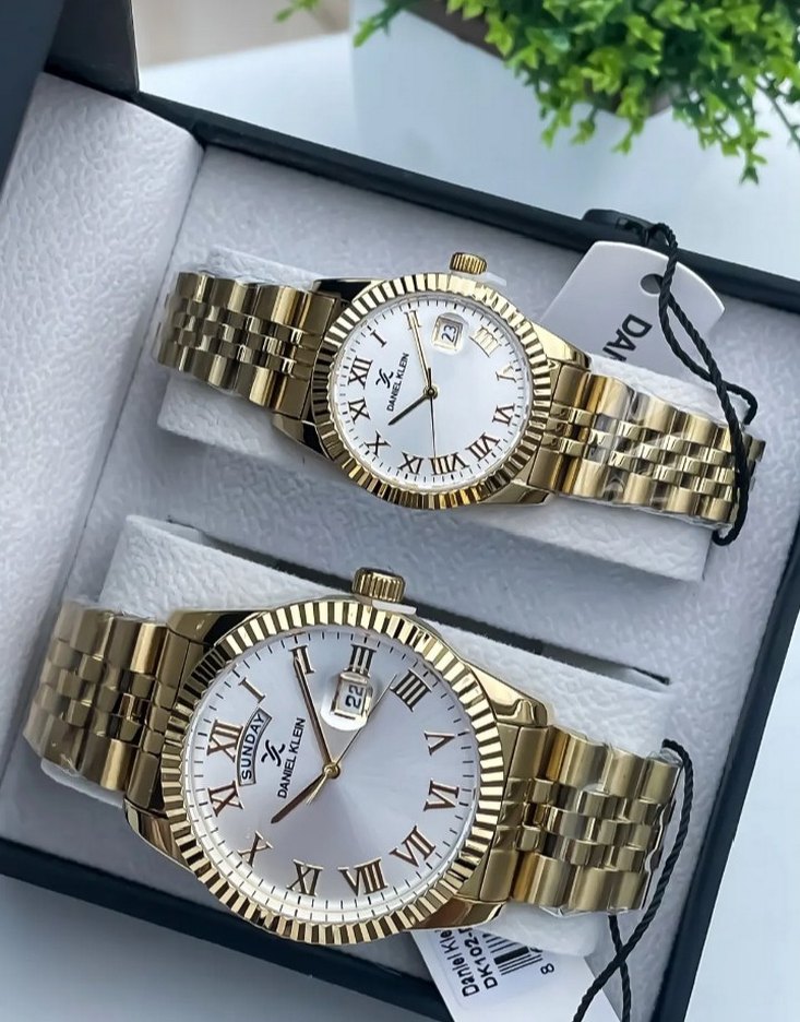Parlak altın renkli, kemerli kayışlı, Roma rakamlı klasik ve modern dokunuşlu çift. ⌚
