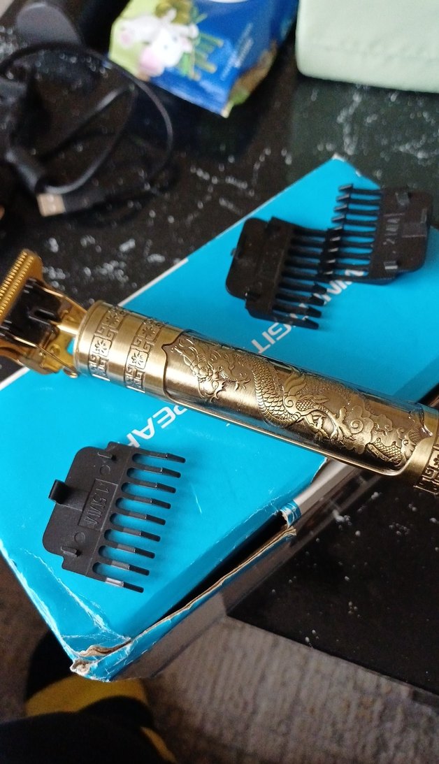 Altın renkli klasik tıraş makinesi, detaylı işlemeli gövde ve farklı kesim için siyah tarak başlıkları ile birlikte. ✂️Rado marka metal,3 adet başlıkla