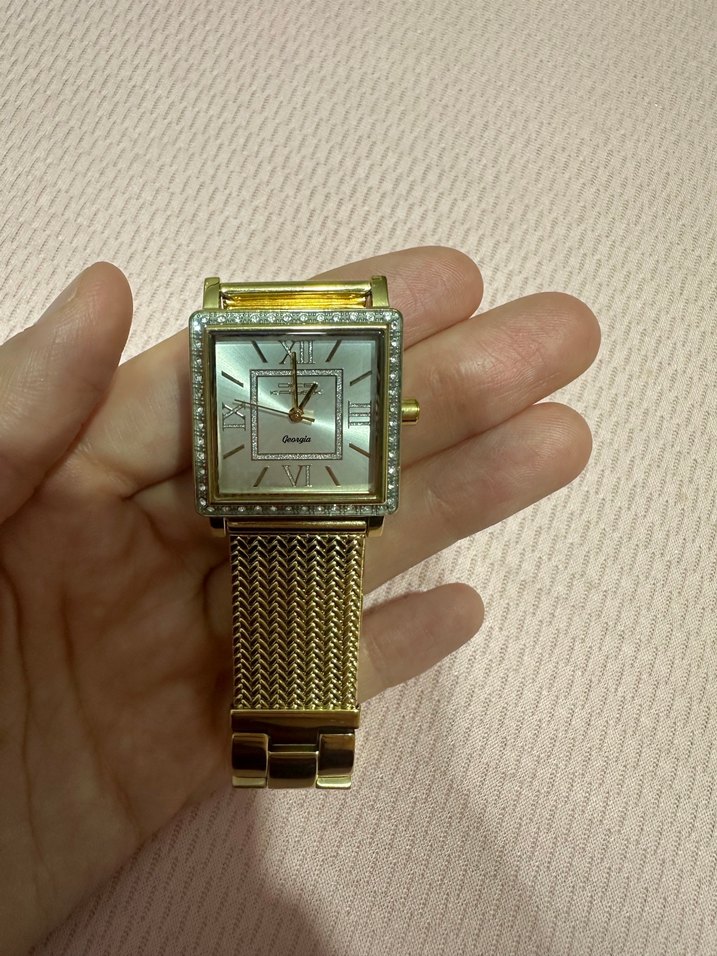 Parlak altın renkli, kemerli tasarıma sahip kadın kol saati. Klasik ve modern tarzı Roma rakamlı kare kadranla birleştirir. ⌚ kuyumcudan alınmıştı. Kullanmadım hiç