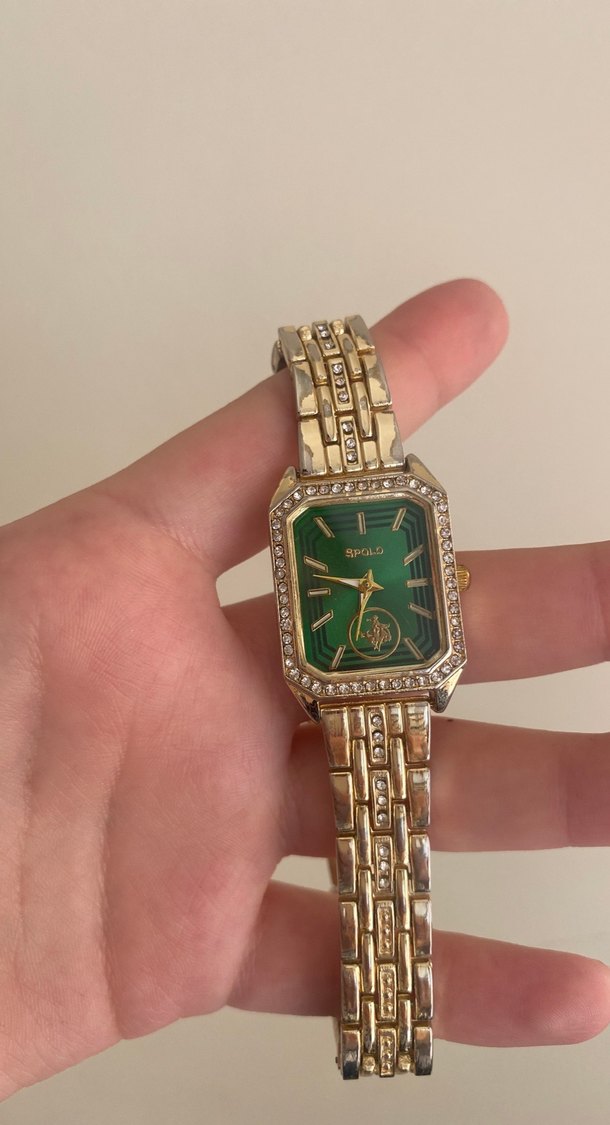 Yeşil dikdörtgen kadran ve taş süslemeli çerçeveye sahip, parlak altın renkli tokalı klasik kadın kol saati. ⌚zincirlilerinde biraz soyulmalar mevcut fotoğrafta gösterdiğim gibi