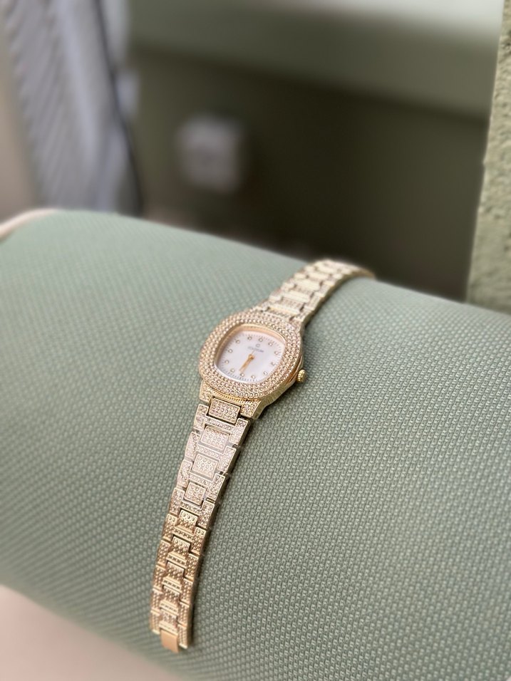 Altın renkli bel kemerli bilekliği ve modern klasik tasarımıyla kadın kol saati, klasik zarafeti gri altın tonuyla buluşturuyor. ⌚