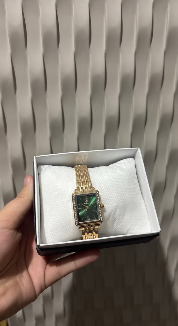 Parlak altın renkli kemerli bilezik ve dikdörtgen yeşil kadranıyla modern klasik şıklığı yansıtan kadın kol saati. ⌚ jelatinli