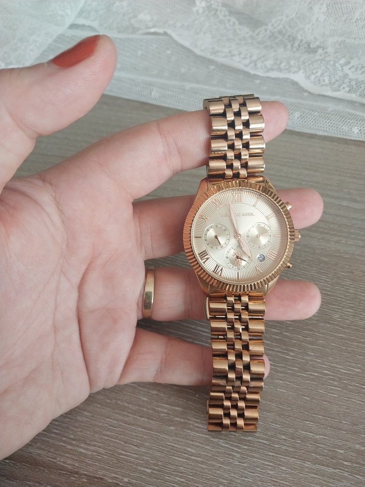 Altın renkli, tokalı bilezikli klasik bohem tarzda kadın kol saati. Çoklu kadranlar ve tarih göstergesi bulunur. ✨ Us polo bir kaç kez kullanıldı temiz ve sorunsuz rose gold rengi