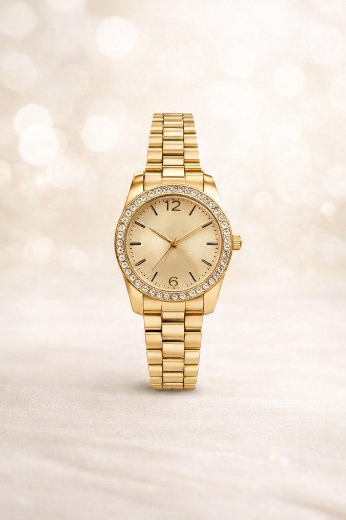 Parlak altın renkli Taşlı çerçeveli ve kemerli bilezikli kadın saati Modern klasik şıklığı yansıtıyor. ⌚