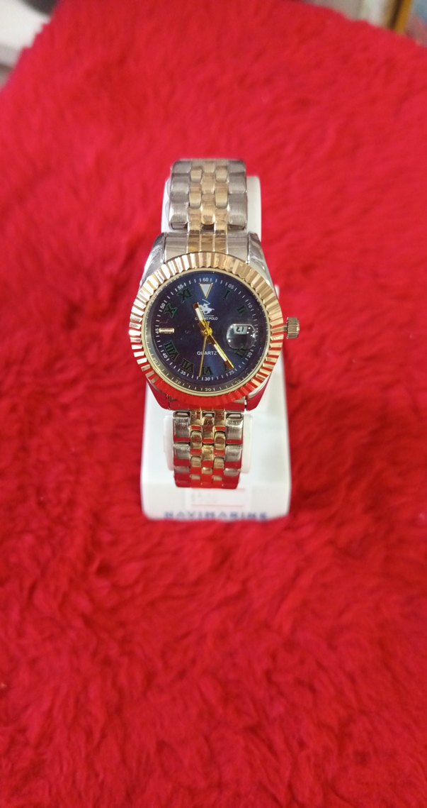 Renkli altın ve gümüş metal kayışlı, koyu kadranlı ve tarih göstergeli klasik kol saati. ⌚
