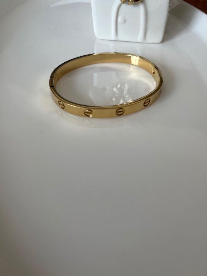 Parlak altın renkli, tokalı ve desen içermeyen minimalist tasarımlı bileklik, günlük kullanıma uygundur. ✨