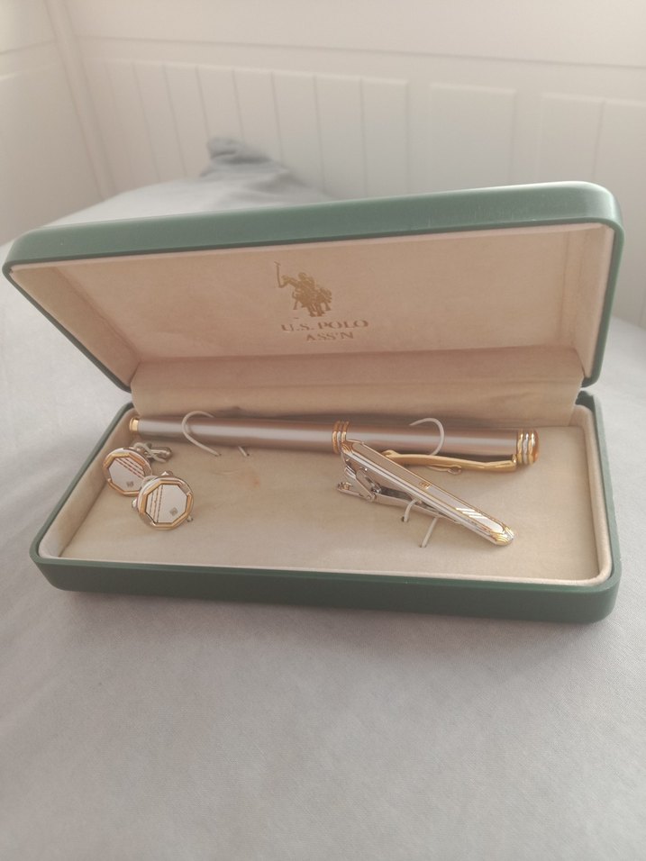 Altın renkli kravat iğnesi ve klips seti, yeşil kutu içinde yumuşak astarlı, şık ve hafif tasarıma sahip. ✒️altın kaplama çizgili