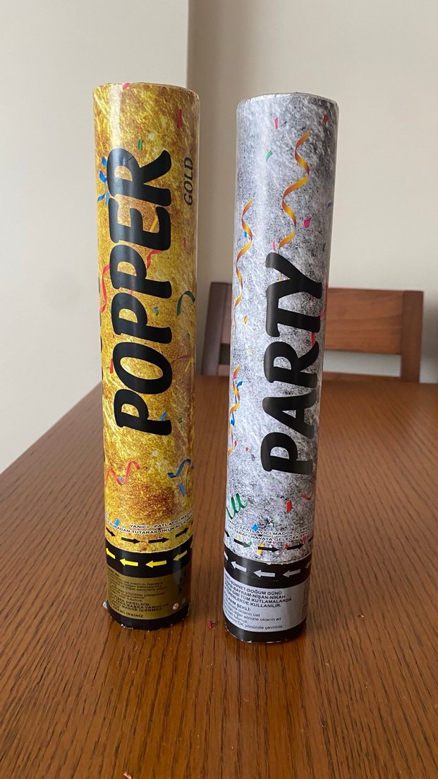 Altın ve gümüş renklerde, konfeti desenli iki adet parti patlatıcısı. Kutlamalar için uygun.