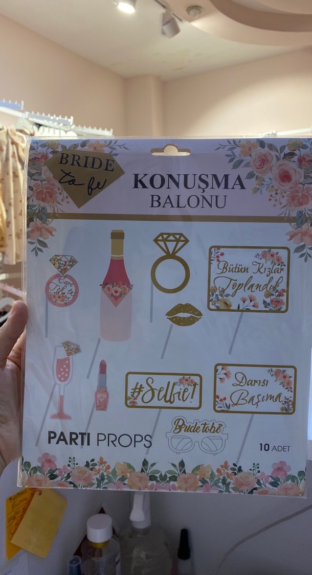Altın renkli, çiçek desenli ve gelin temalı ifadeler içeren 10 adet konuşma balonu seti.