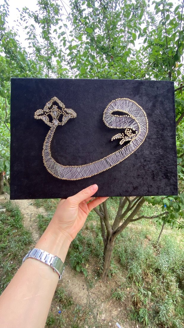Koyu zemin üzerinde altın renkli ip sanatından oluşan zarif bir tablo. Detaylı desen, esere eşsiz bir hava katıyor.