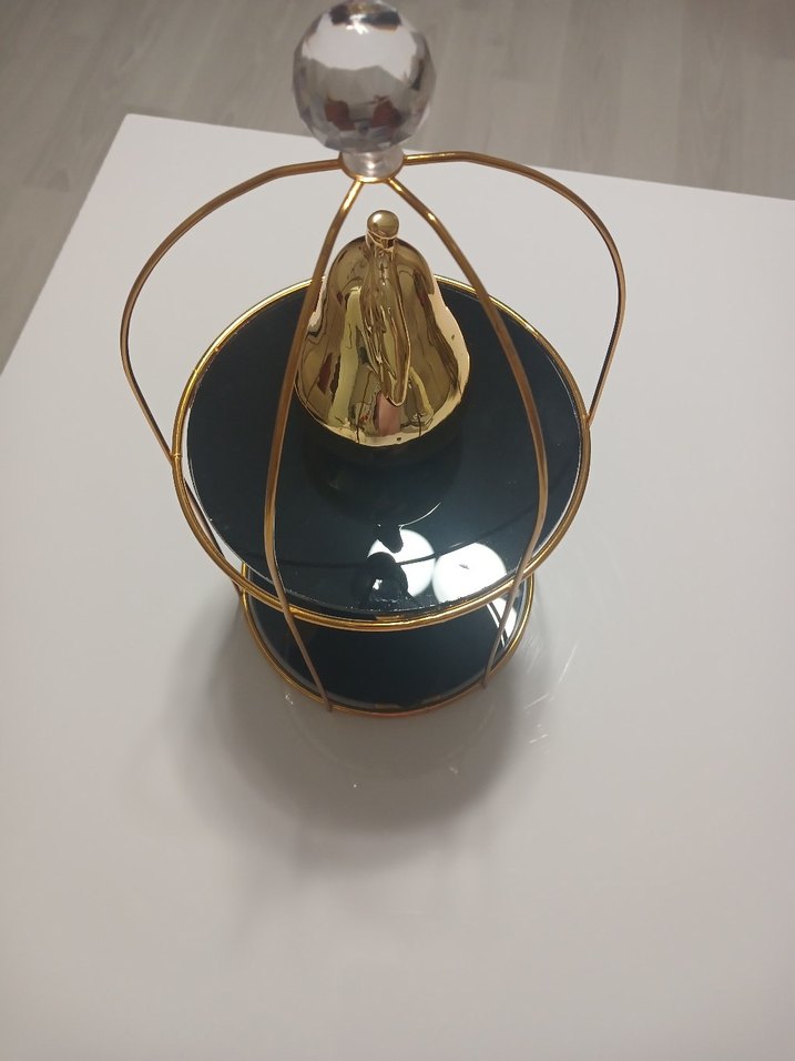 Altın renkli çerçeve ve üstte küre şeklinde kulp ile koyu renk mumluk, şıklık ve fonksiyonellik sunar. ️