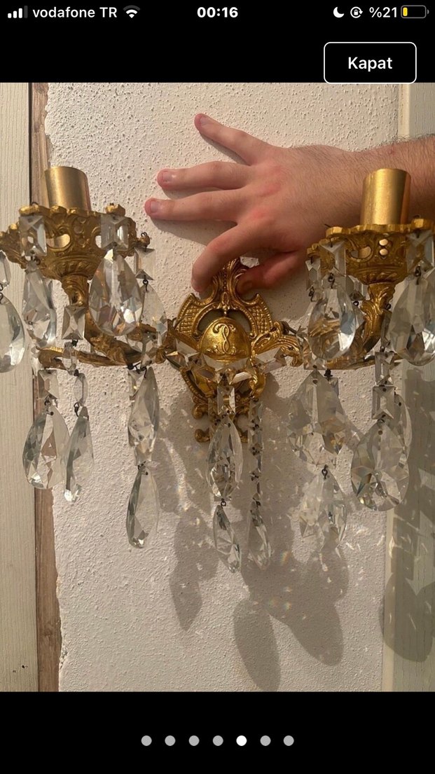 İki mum şeklinde ışık tutuculu, kristal süslemeli parlak altın duvar lambası. Dekoratif ve şık tasarım. 2 adet duvar 1 adet tavan için var prinçtir.Antika .Alım için yazınız