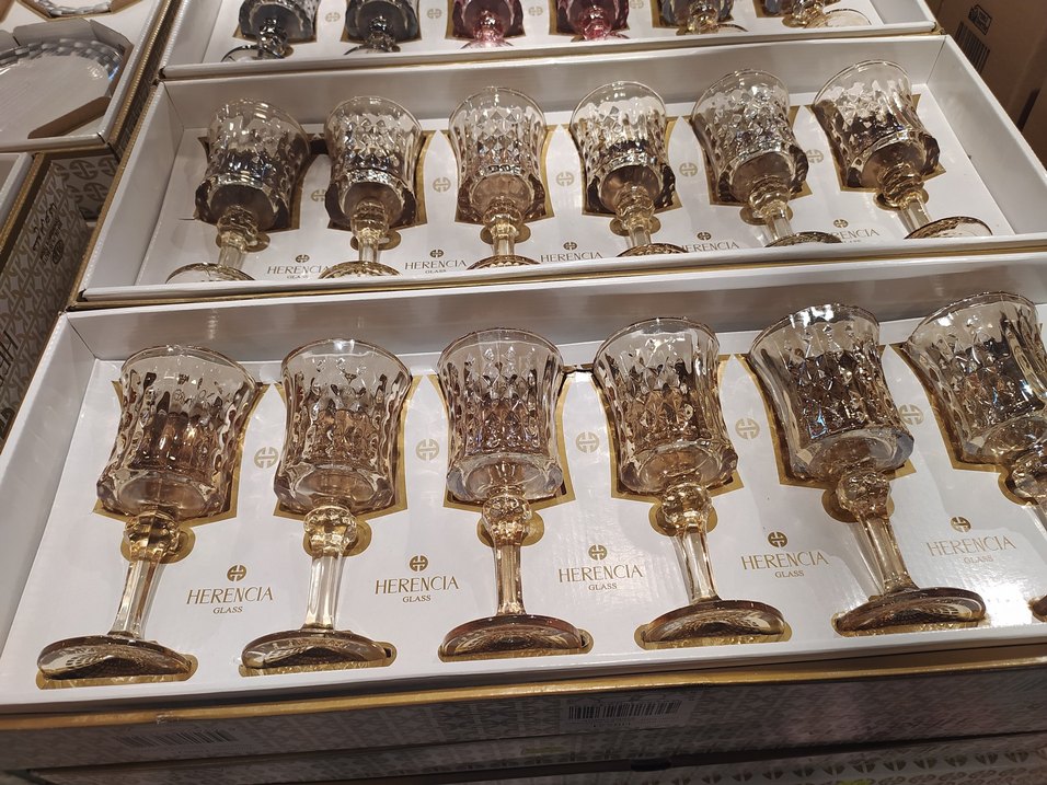 İnce kesim desenlere sahip, açık altın renkli kristal kadehlerden oluşan set. Zarif içecek sunumları için uygundur.