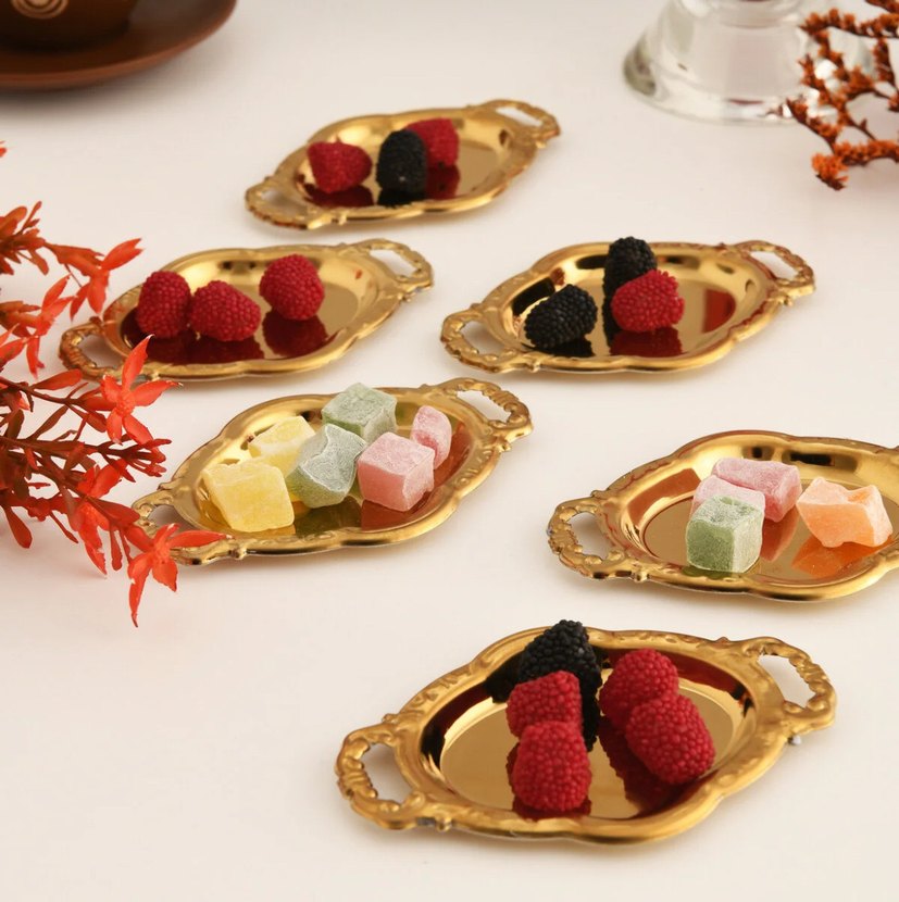 Altın renkli küçük servis tepsileri, süslü kulpları ve parlak yüzeyi ile renkli ikramlar için uygun. Lokumluk , kahve yanı sunumluk