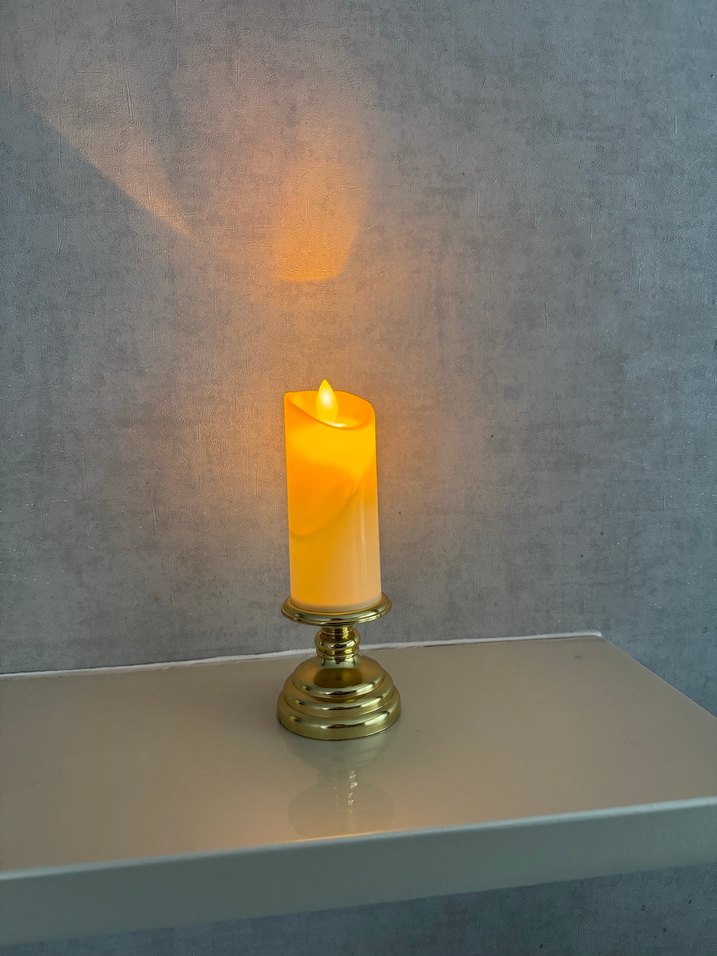 Işık altın renginde led mum, parlak altın renkli mumluk üzerinde, sıcak bir atmosfer yaratıyor. Hafif bir üründür, 3 tane pil ile çalışır