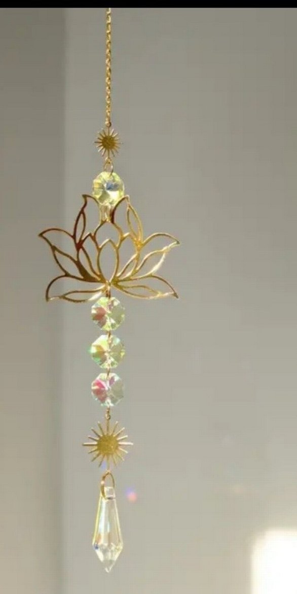 Altın renginde lotus şeklinde kristal boncuklar ve güneş motifleri içeren ışığı yansıtan sarkaç. ✨