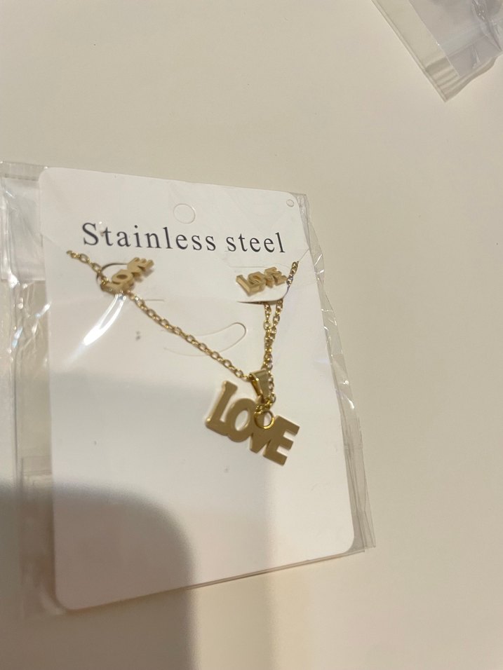 Altın renkli paslanmaz çelikten yapılmış, zincir detaylı "LOVE" yazılı kolye küpe seti. Parlak yüzeyli ve normal midi uzunlukta, minimalist sokak stili için uygun.