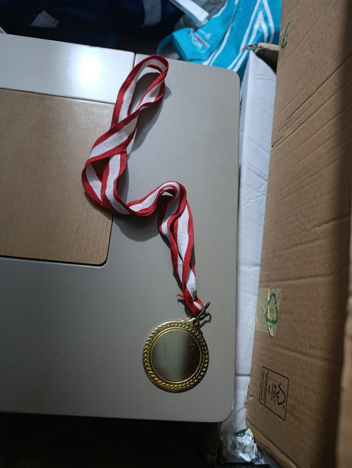 Kırmızı beyaz şeritli kurdeleye bağlı, parlak altın renkli, sade ve minimalist erkek madalyası.