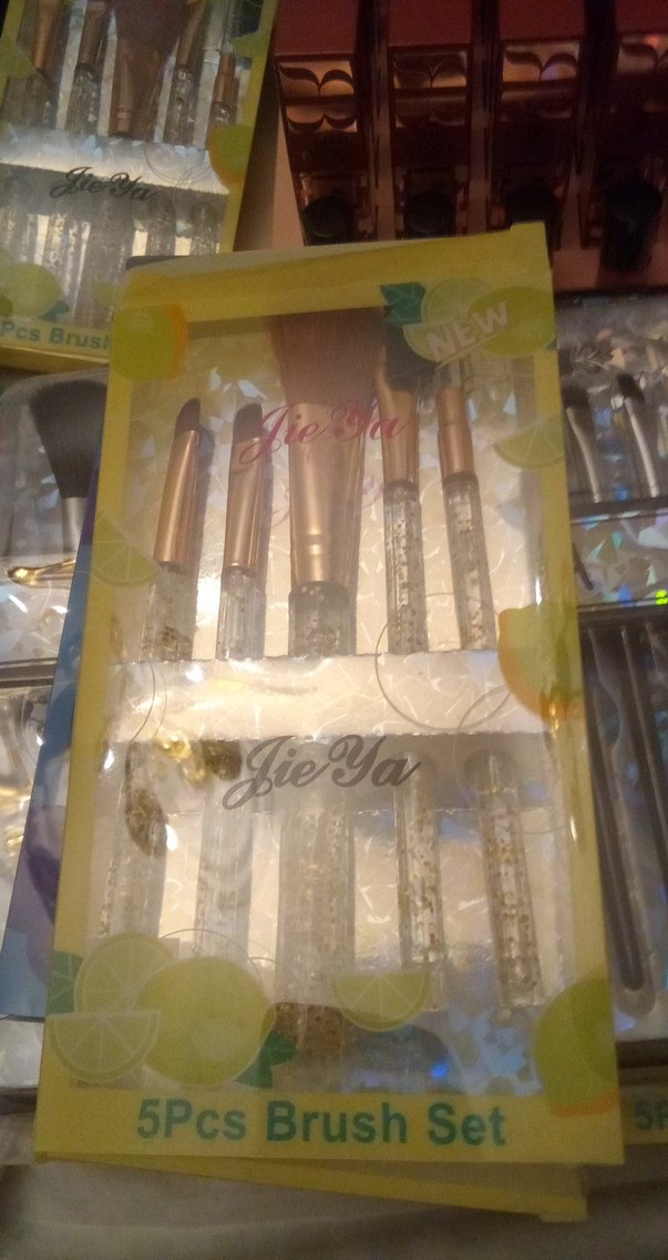 Altın renkli sapları ve şeffaf dokulu tutacakları olan çeşitli makyaj fırçalarından oluşan set, sarı kutuda sunulmuştur. ✨
