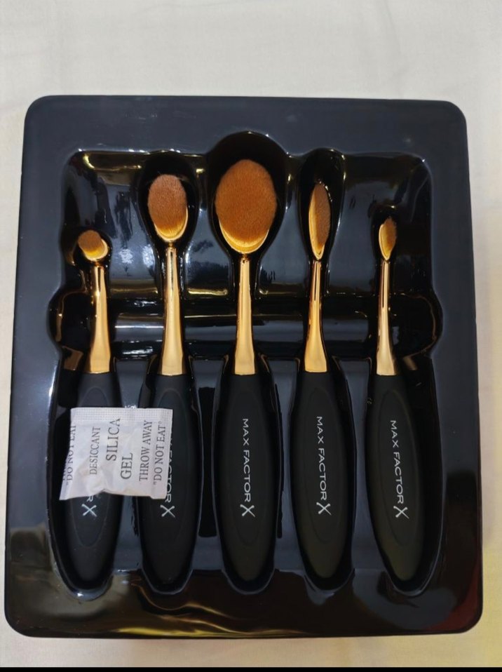 Beş adet, koyu renk kıllara ve altın saplara sahip makyaj fırçası seti, pürüzsüz uygulama sağlar. ️