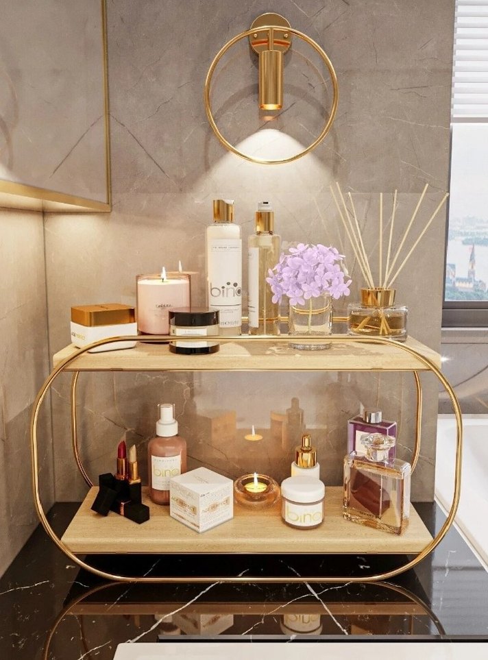 Altın renkli, açık renk ahşap tabanlı, çeşitli kozmetik ve parfümler için modern tasarımlı makyaj organizeri.