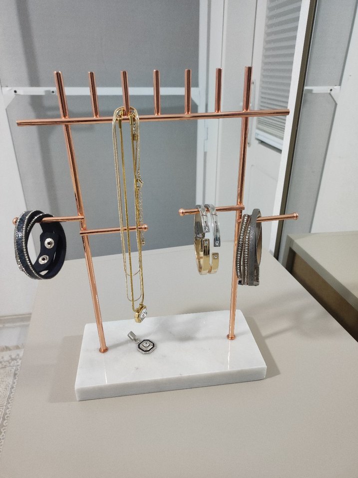 Altın renkli, beyaz mermer tabanlı makyaj ve takı organizeri. Çoklu askılarıyla aksesuarları düzenlemek için kullanılır.