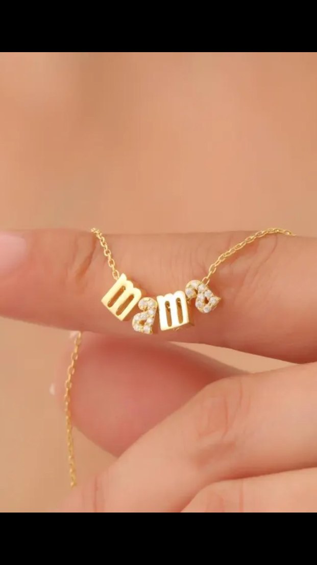 Altın renkli, boncuklu 'mama' yazılı kolye. Minimalist ve bohem tarzda, midi uzunlukta, romantik akşamlar için uygun.