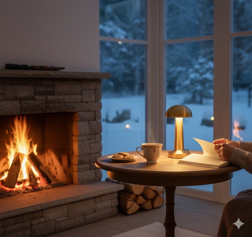 Altın renginde masa lambası, yumuşak ve sıcak ışık verir, ortama şık ve rahat bir hava katar.