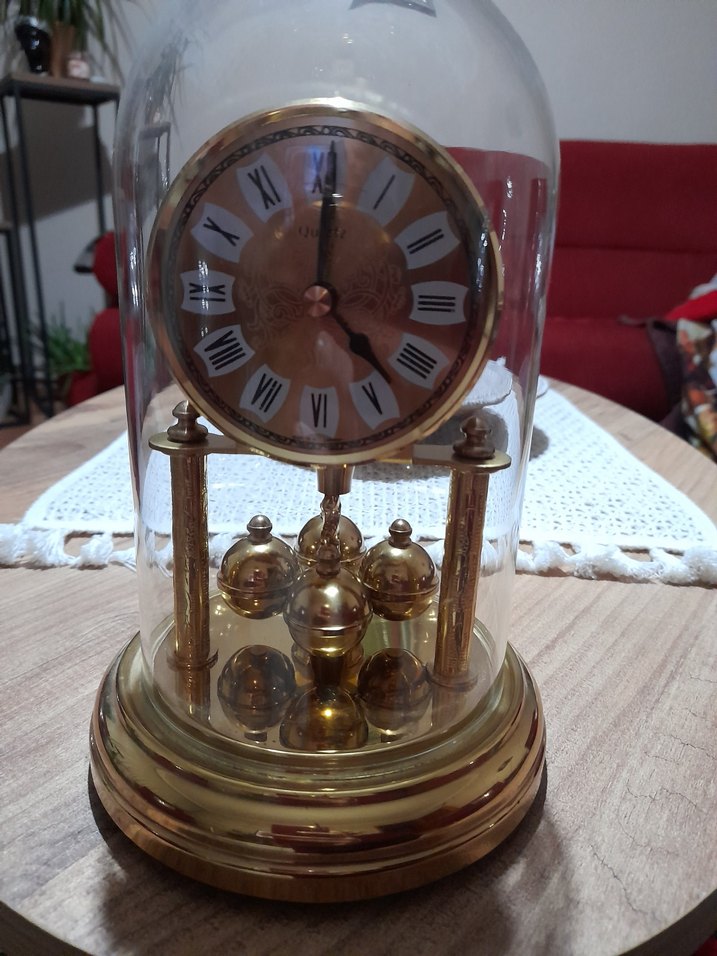 Koyu altın renginde, şeffaf cam kubbe kapaklı masa saati. Klasik ve zarif tasarım sunar. ⏰