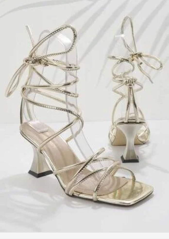 Altın renkli metal malzemeden yapılmış, stiletto topuklu, dantel bağcıklı ve yılan deseni detaylı kadın abiye ayakkabı. ✨ 1 kere giydim