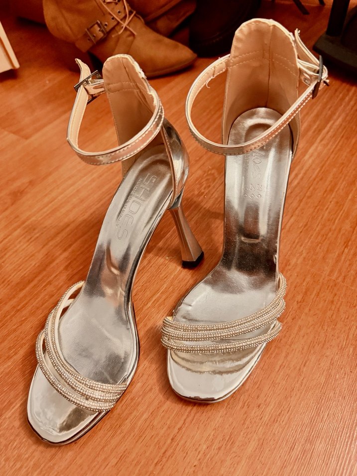 Parlak altın renkli metal stiletto topuklu, tokalı bilek kayışlı ve yılan derisi desenli kadın abiye ayakkabı. ✨