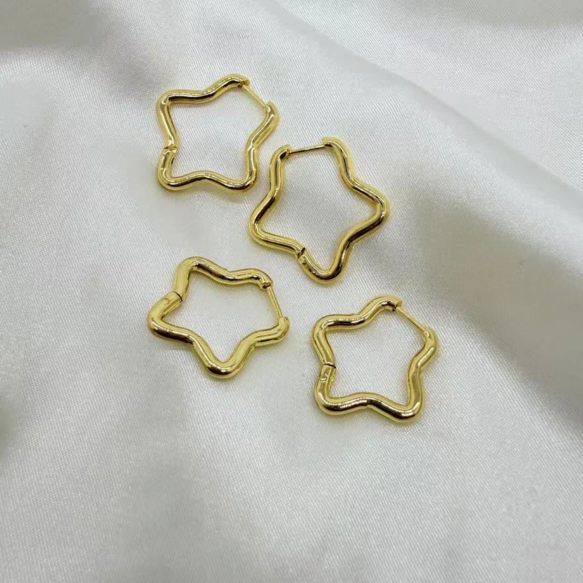 Parlak altın renkli, boncuk detaylı, yıldız şeklinde midi boy küpeler. Modern ve minimal tarzlar için uygun.
