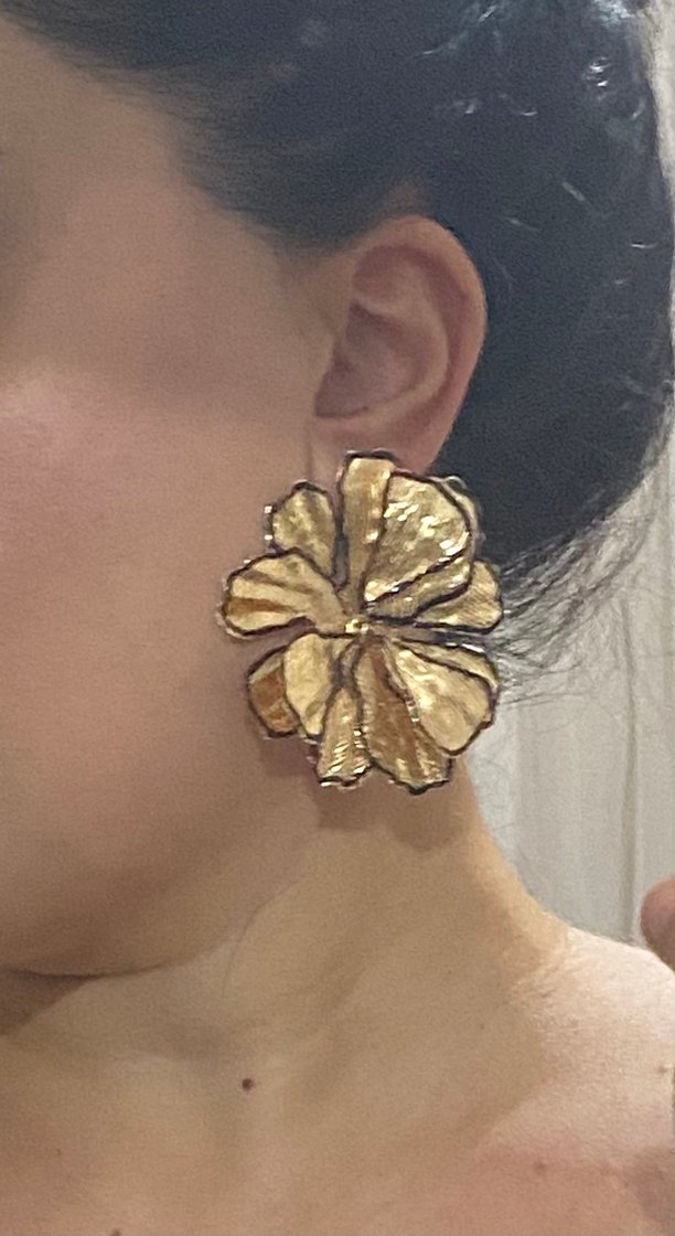 Parlak altın renkli, çiçek desenli ve fırfırlı detaylara sahip midi uzunlukta küpe. Düğün ve bohem tarzlar için uygun. Hiç kullanılmadı Boyutu büyük