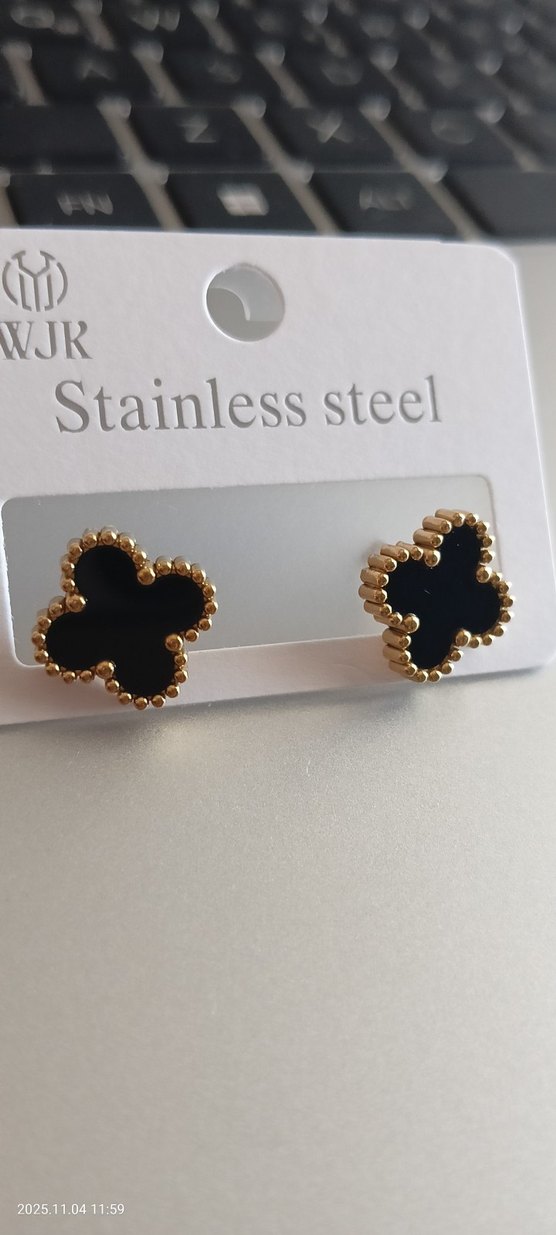 Altın renkli paslanmaz çelik mini küpeler, boncuklu kenarları ve koyu renkli baskılı çiçek deseniyle romantik akşamlar için uygundur.