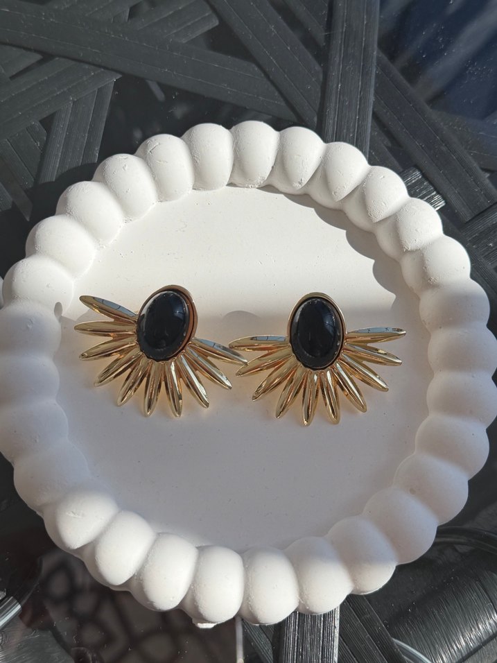 Altın renginde, koyu boncuklu ortası ve güneş ışını tasarımı olan mini küpeler. Romantik akşamlar için kısa ve modern tarzda. ✨