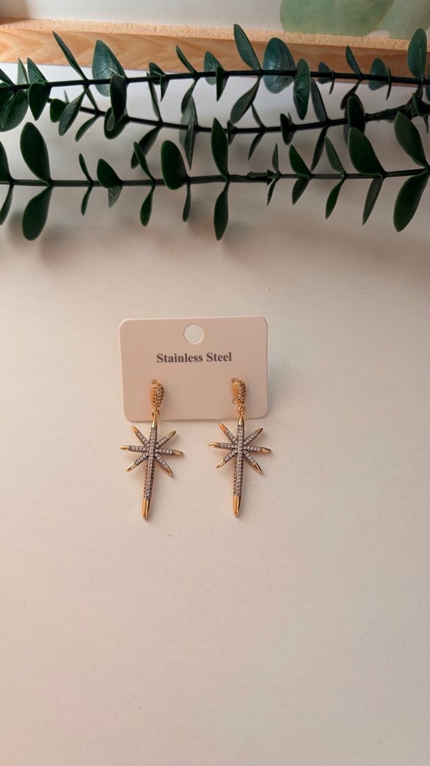 Paslanmaz çelikten, altın renkli mini boncuklu küpe. Parlak yüzeyli ve baskılı yıldız deseniyle günlük sokak tarzına uygun. ✨