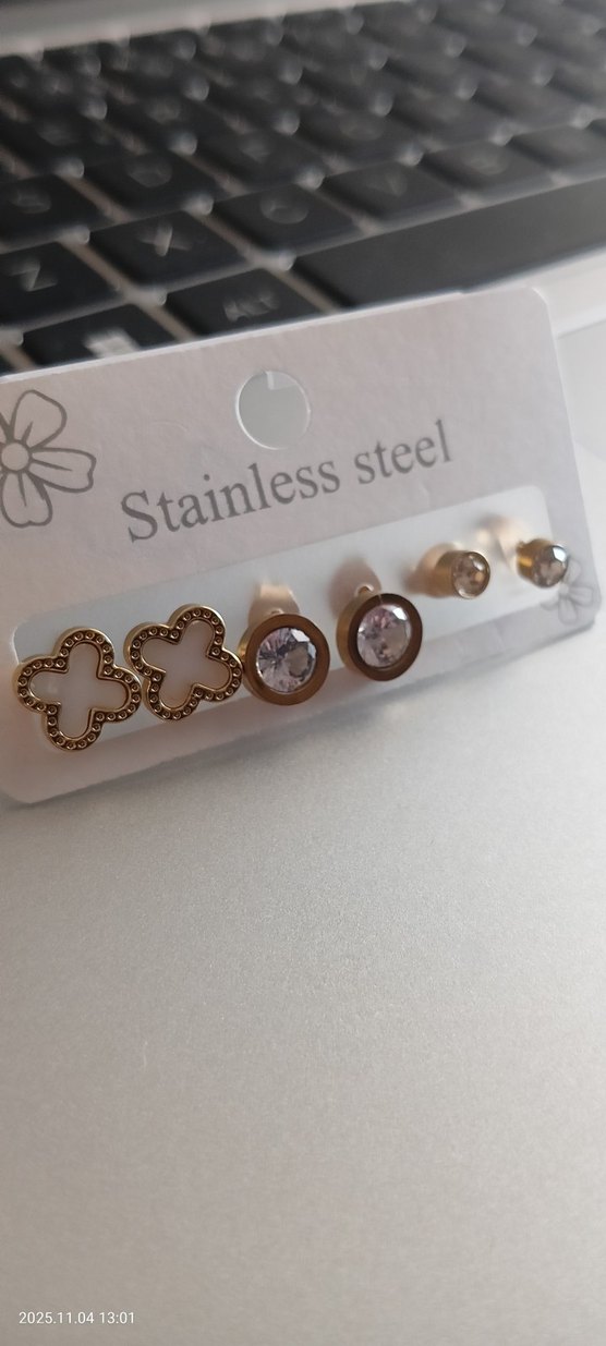 Paslanmaz çelikten yapılmış, altın renkli, mini uzunlukta üç çift küpe seti. Parlak yüzeyli, baskılı ve pul desenli, günlük kullanıma uygun.