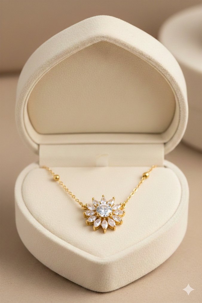 Altın renkli kısa zincir kolye, çiçek desenli ve ortasında parlak kristal taş bulunan klasik şıklık için ideal.