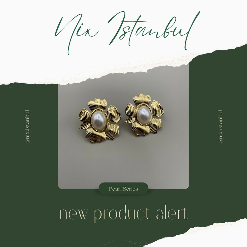 Altın renkli, çiçek desenli mini küpeler, boncuk detaylı ve inci merkezli. Romantik gece için uygun. Pearl Serisi.
