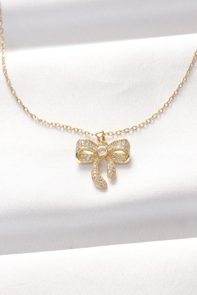 Kadınlar için kısa altın zincir ve ışıltılı detaylı mini fiyonk kolye. Günlük kullanımda klasik zarafeti çağrıştıran çağdaş tasarım.