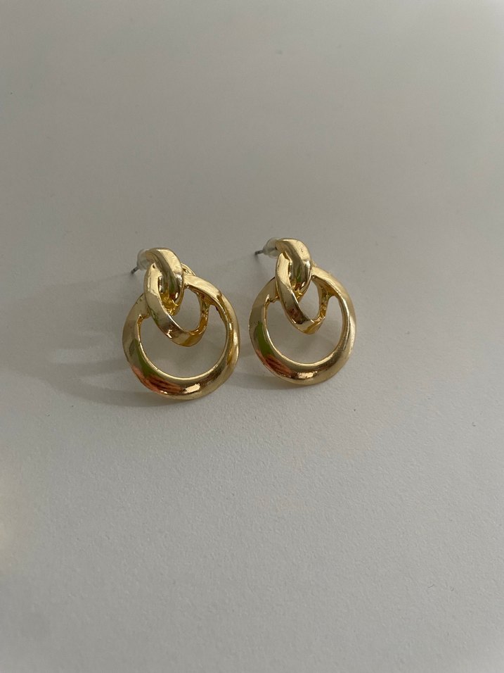 Parlak altın renkli, tokalı kısa halka tasarımlı küpeler. Minimalist ve çağdaş tarzda, sade ve temel stil için uygun.