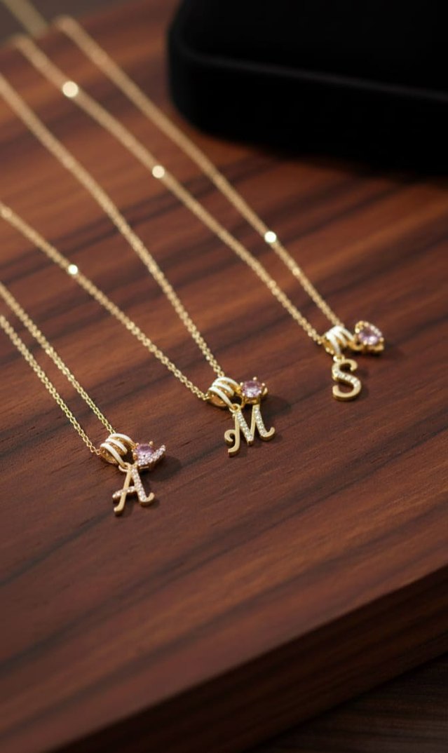 Altın renkli, ince zincir detaylı mini harf kolyeler, işlenmiş kalp süslemeleriyle romantik akşamlar için cesur ve minimal bir tarz sunar.