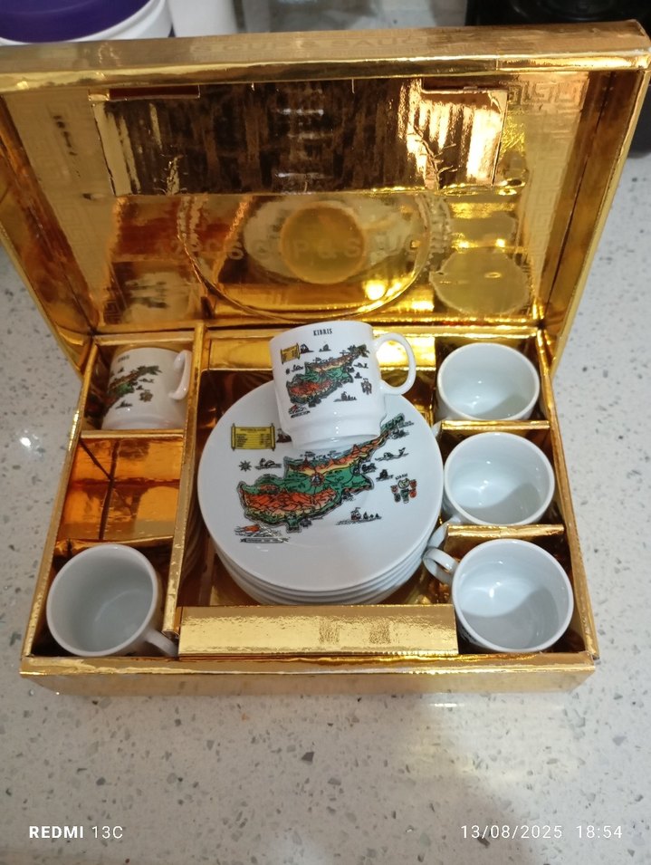 Renkli harita desenli mini kahve fincanları ve tabakları, altın renkli kutuda sunuluyor. ☕